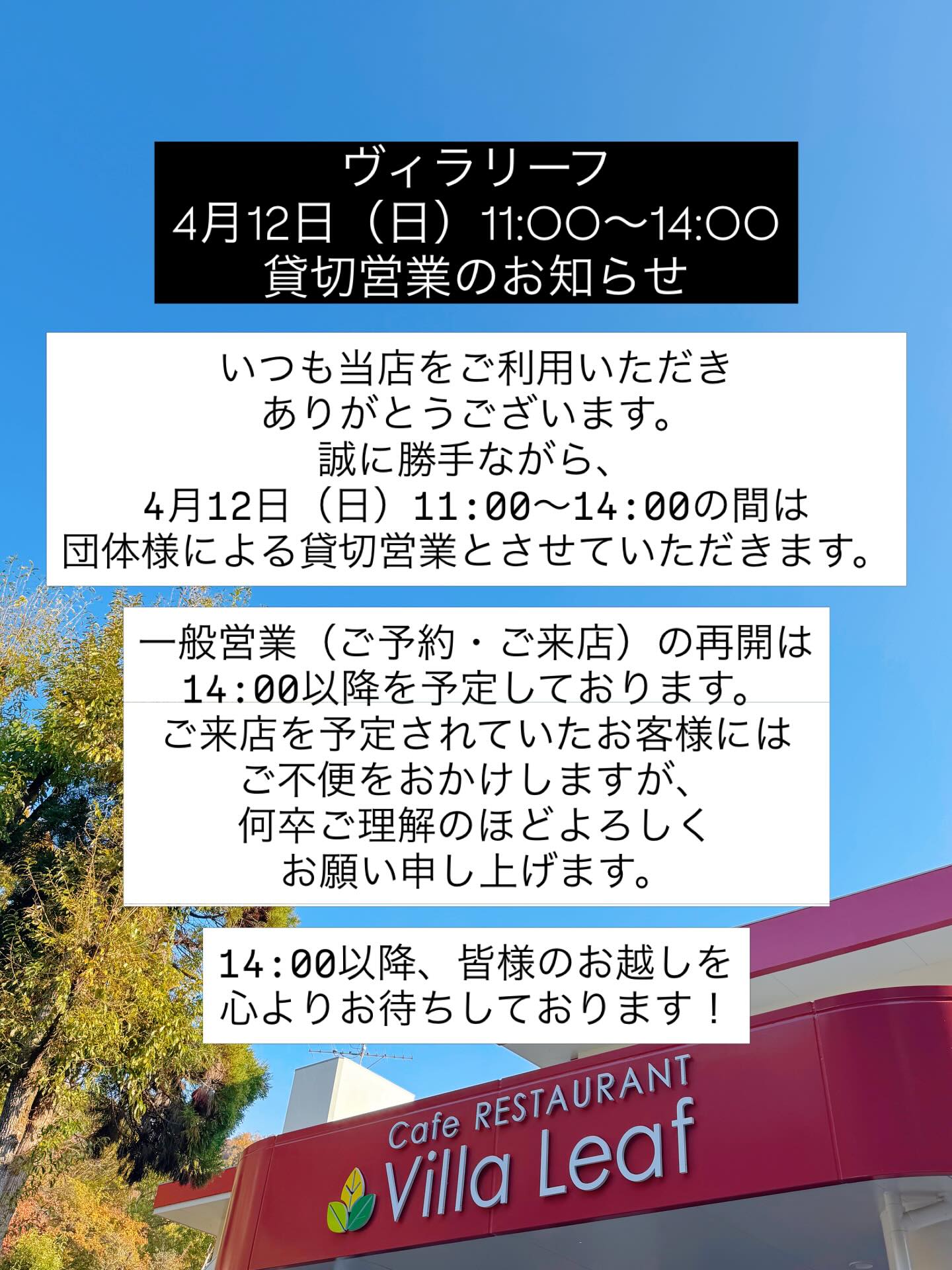- 【4月12日(日)11:00〜14:00貸切営業のお知らせ】